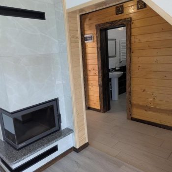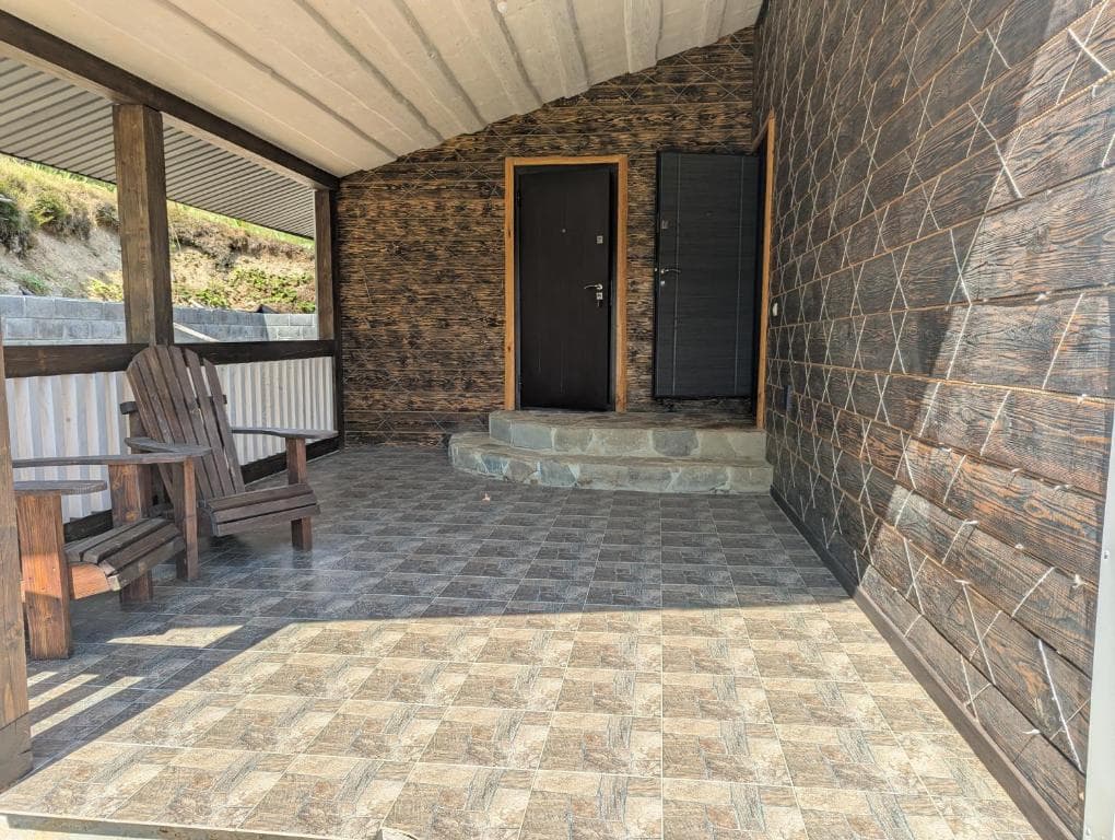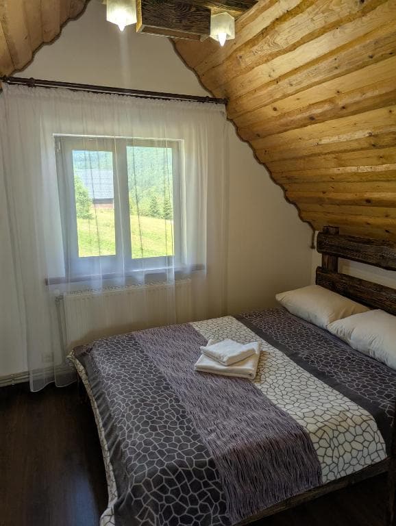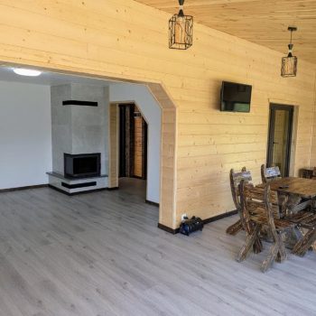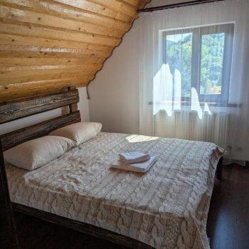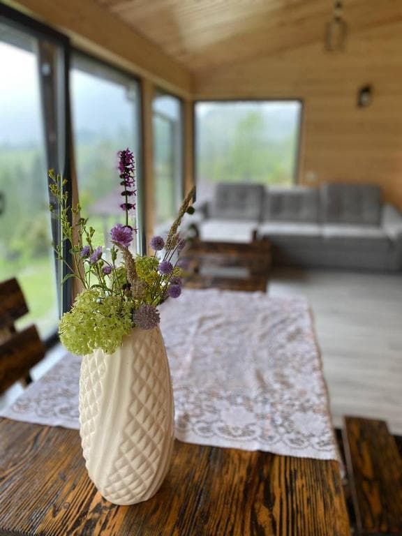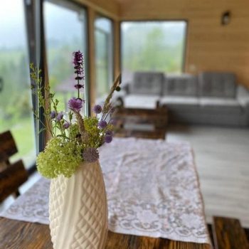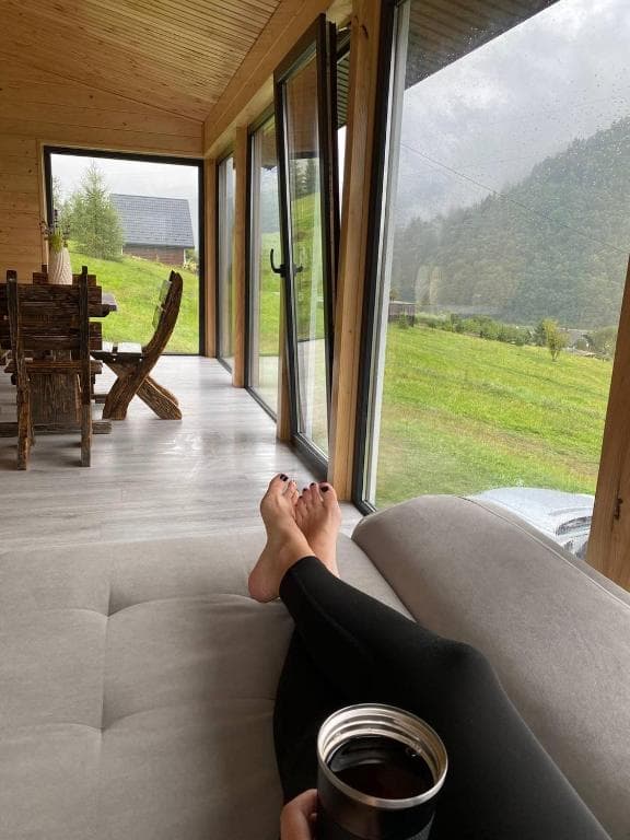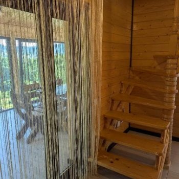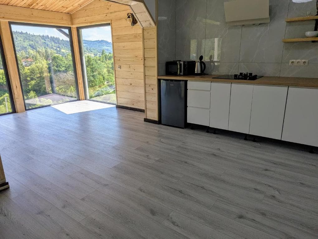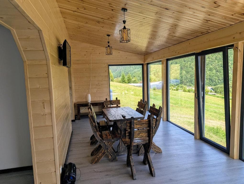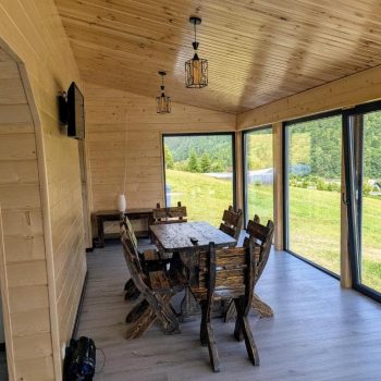 Вітальня з великими панорамними вікнами дозволяє максимально насолоджуватися краєвидами, а камін додає тепла та романтики прохолодними вечорами. Кухня повністю обладнана всім необхідним для приготування їжі. Дві невеликі спальні кімнати оформлені з натуральних матеріалів, що гармонійно вписуються в навколишній ландшафт.