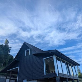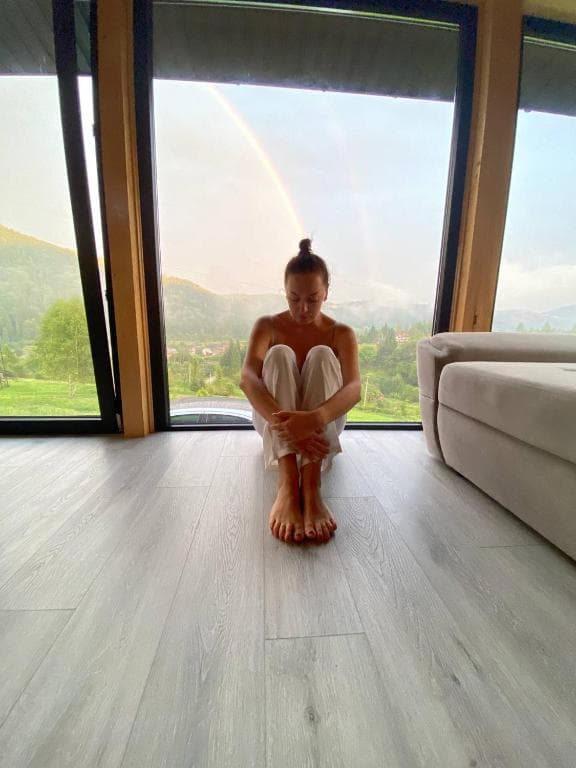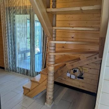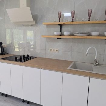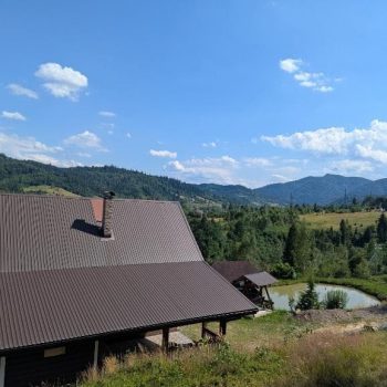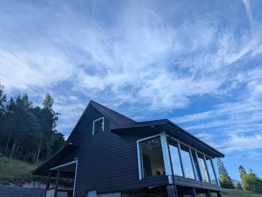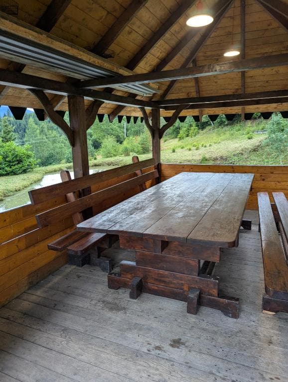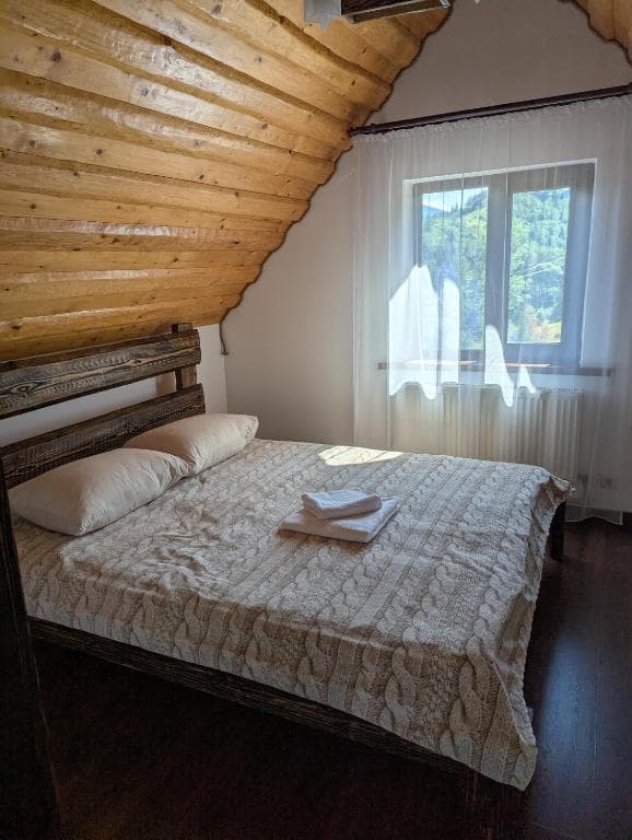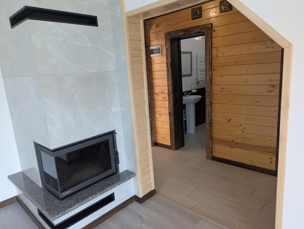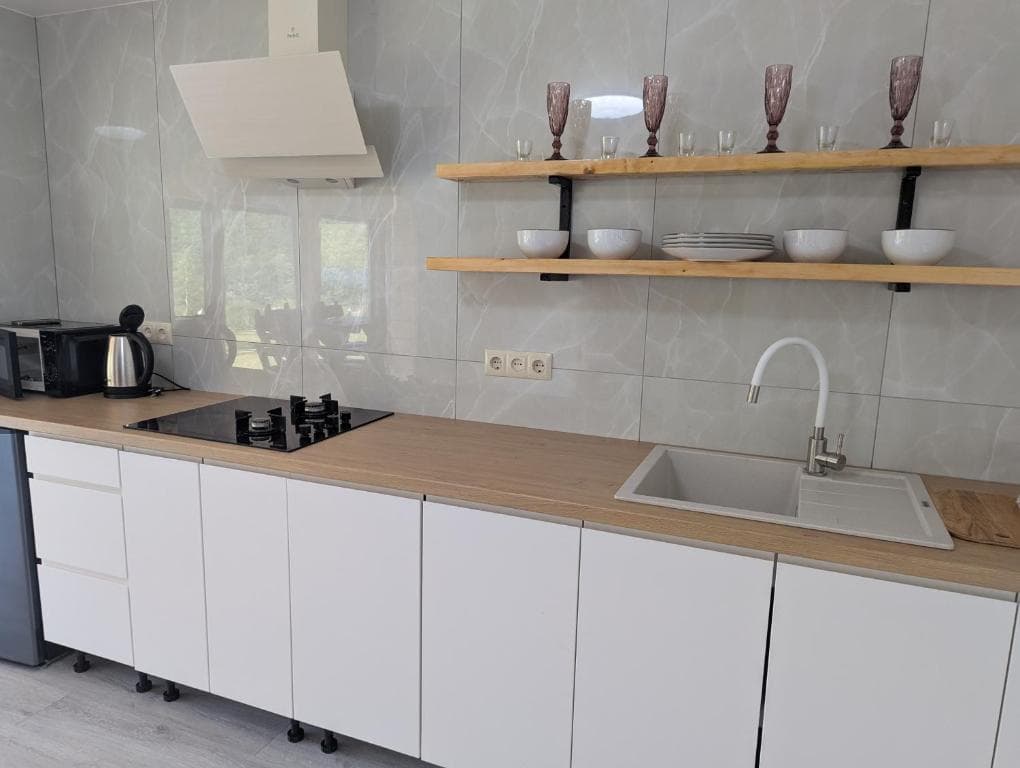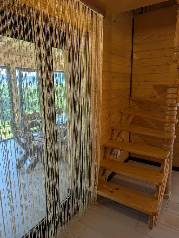Вітальня з великими панорамними вікнами дозволяє максимально насолоджуватися краєвидами, а камін додає тепла та романтики прохолодними вечорами. Кухня повністю обладнана всім необхідним для приготування їжі. Дві невеликі спальні кімнати оформлені з натуральних матеріалів, що гармонійно вписуються в навколишній ландшафт.