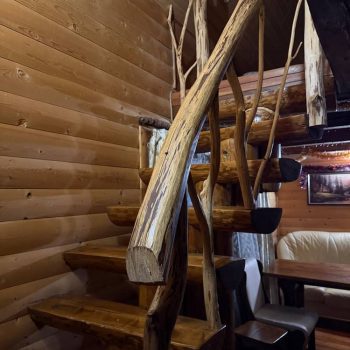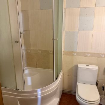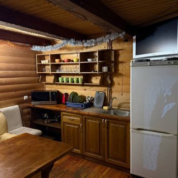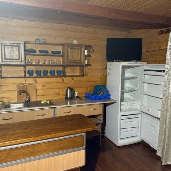 На першому поверсі розташована вітальня з розкладним диваном, обіднім столом, телевізором та кухонним куточком із холодильником, електрочайником і посудом, а також санвузол із душовою кабіною та феном.