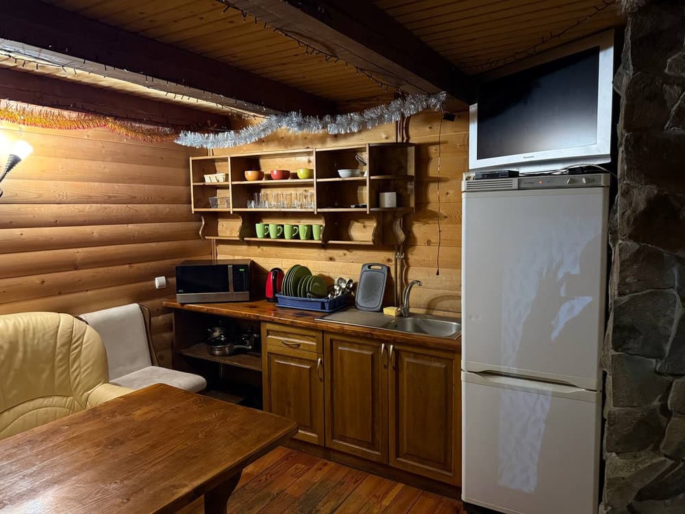 На першому поверсі облаштована затишна вітальня з кухонним куточком, оснащеним холодильником, мікрохвильовою піччю, електрочайником і необхідним посудом, а також санвузол із душем і феном.