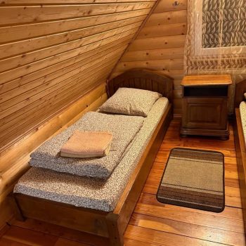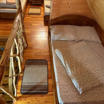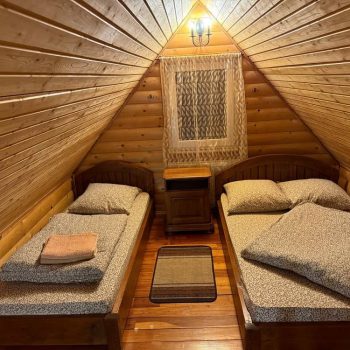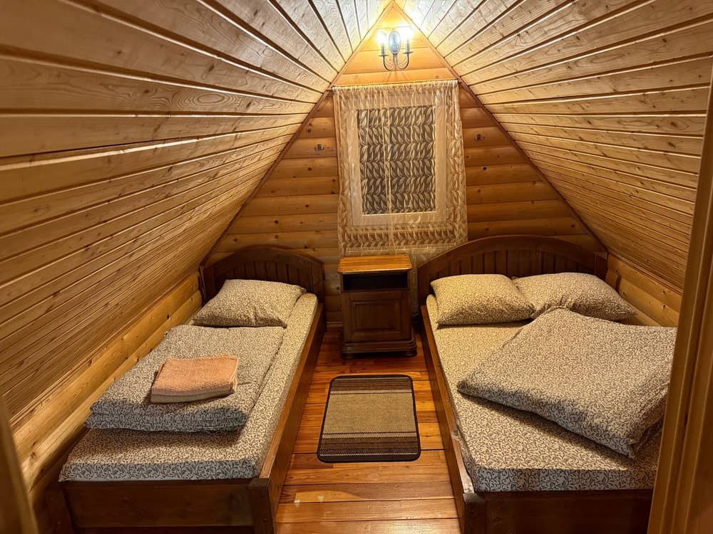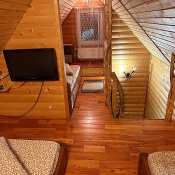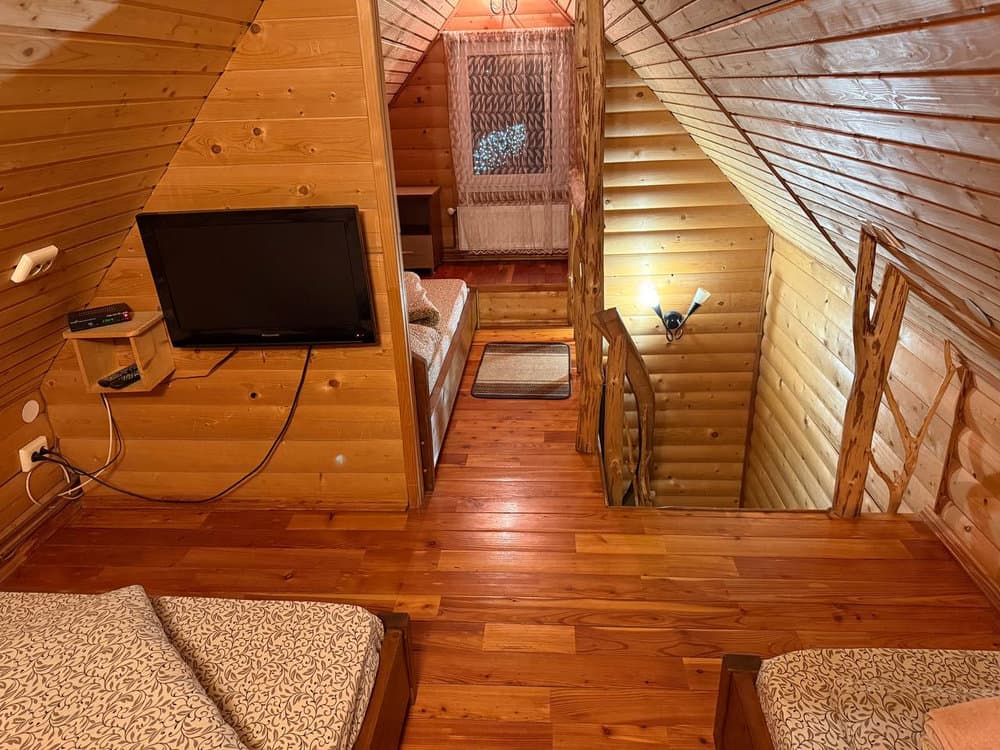 Другий поверх включає дві окремі кімнати: одну з двоспальним ліжком, балконом і телевізором, іншу з трьома односпальними ліжками та телевізором.
