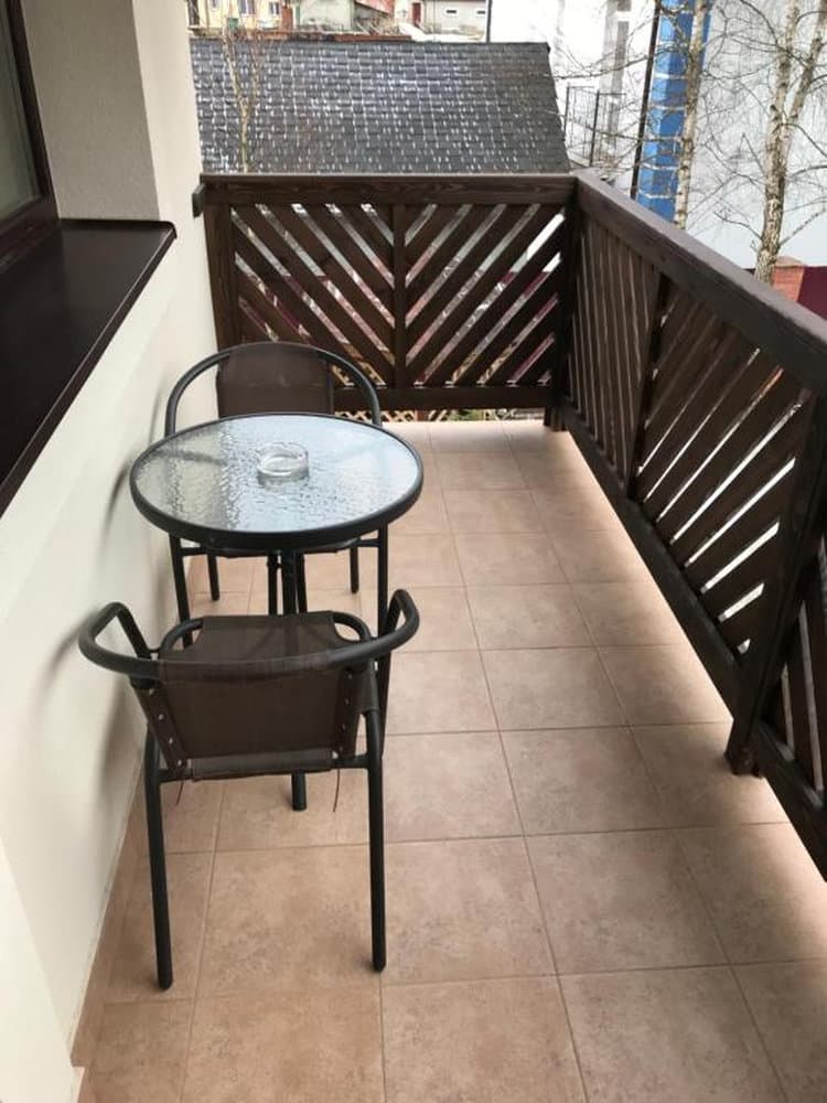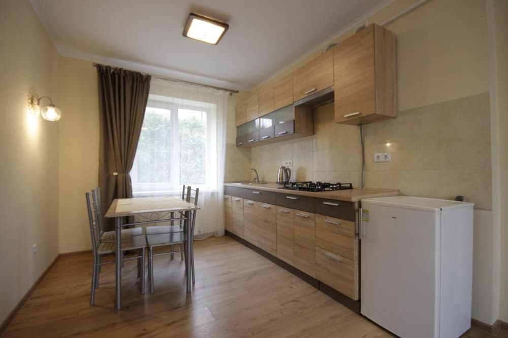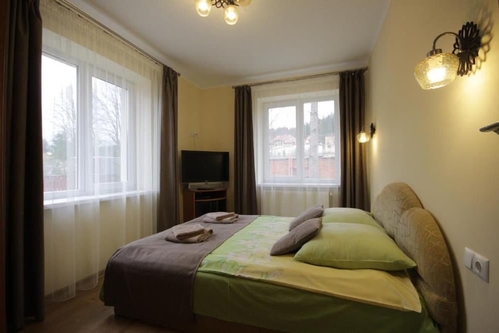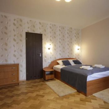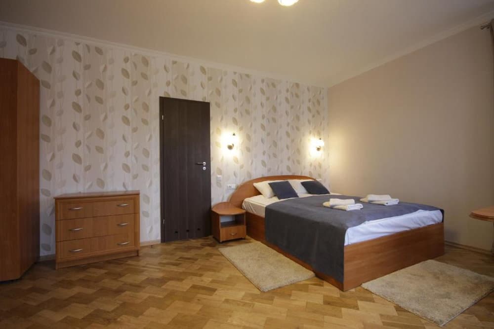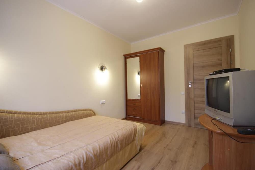 Просторий трикімнатний варіант площею близько 45 м², розрахований на 2–4 гостей. Складається з окремих спалень із двоспальним та односпальними ліжками, кожна кімната оснащена телевізором із супутниковими каналами. До послуг гостей повноцінна кухня з необхідною технікою, посудом і обідньою зоною, а також санвузол із ванною, умивальником і туалетом, що створює комфортні умови для тривалого проживання.