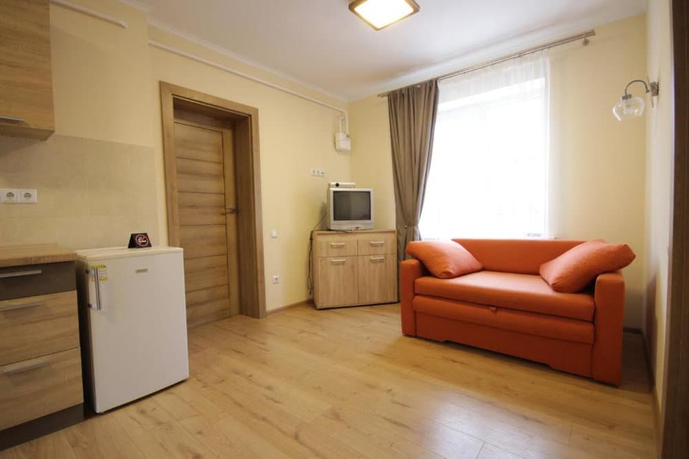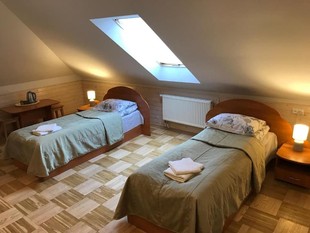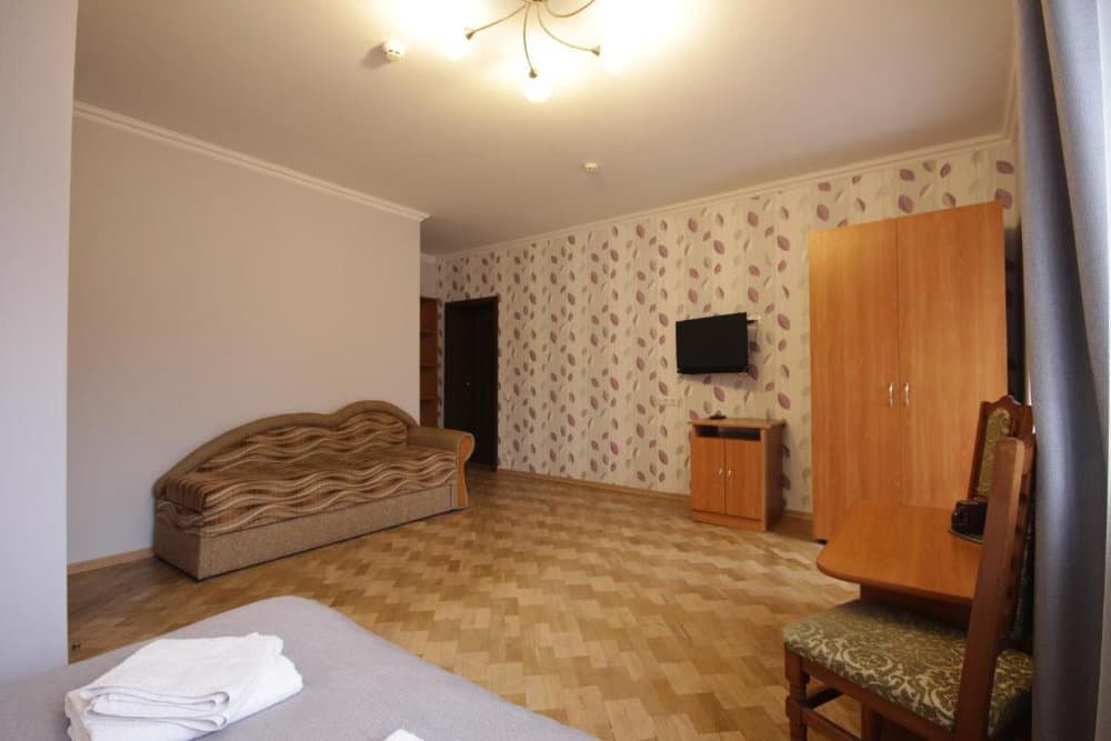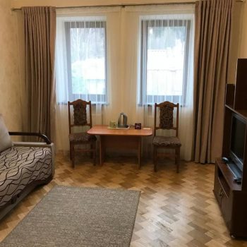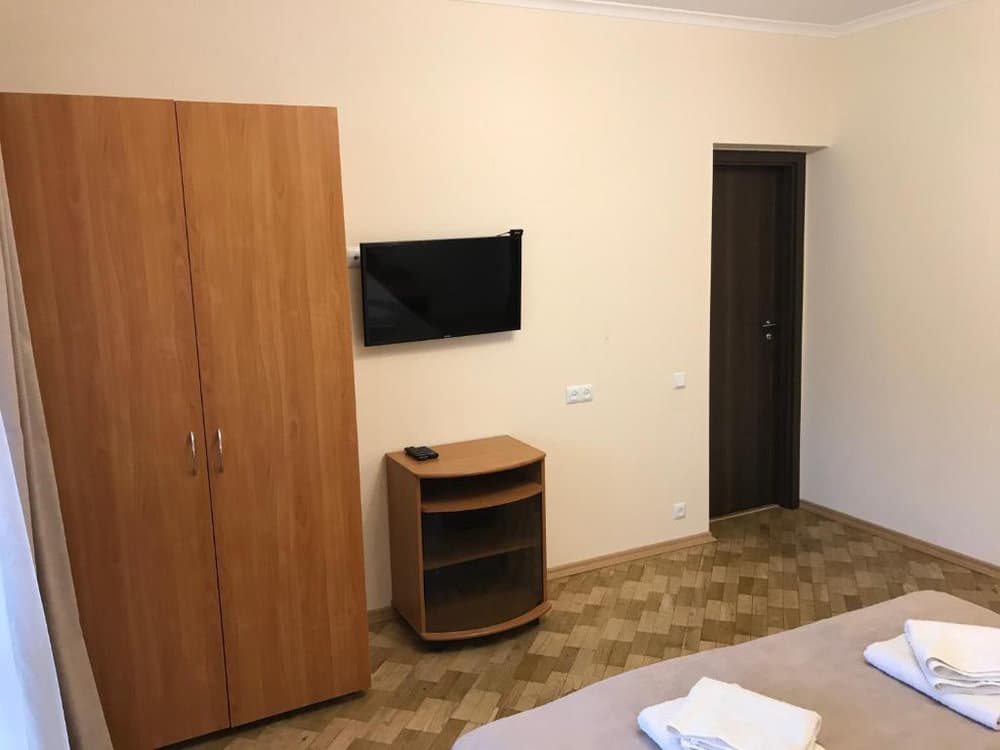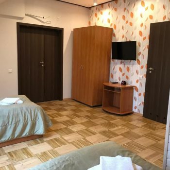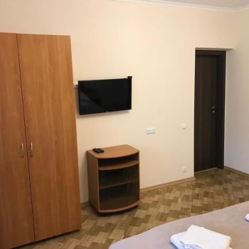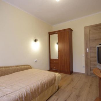 Компактний однокімнатний номер площею близько 20 м², обладнаний двома односпальними ліжками та м’якою частиною. У номері є телевізор із супутниковими каналами та власний санвузол із душем, умивальником і туалетом, а також необхідна кількість рушників для комфортного перебування.