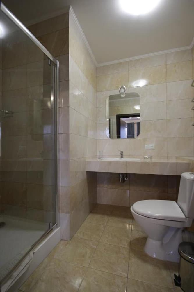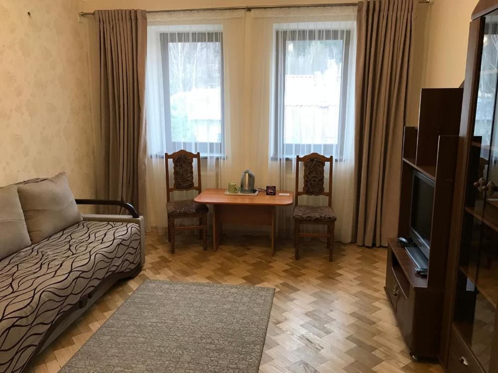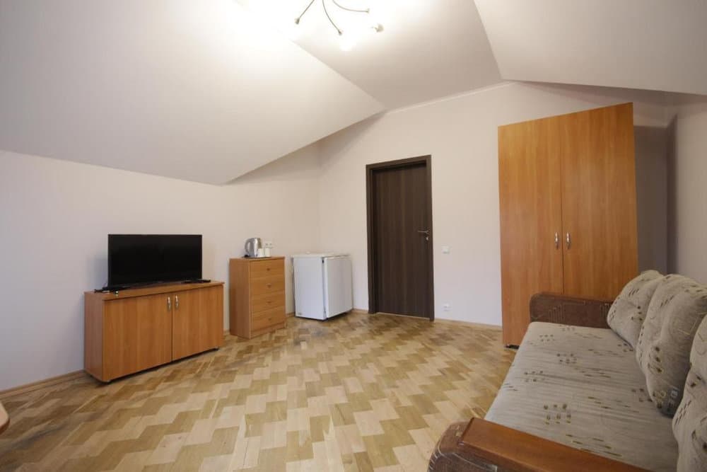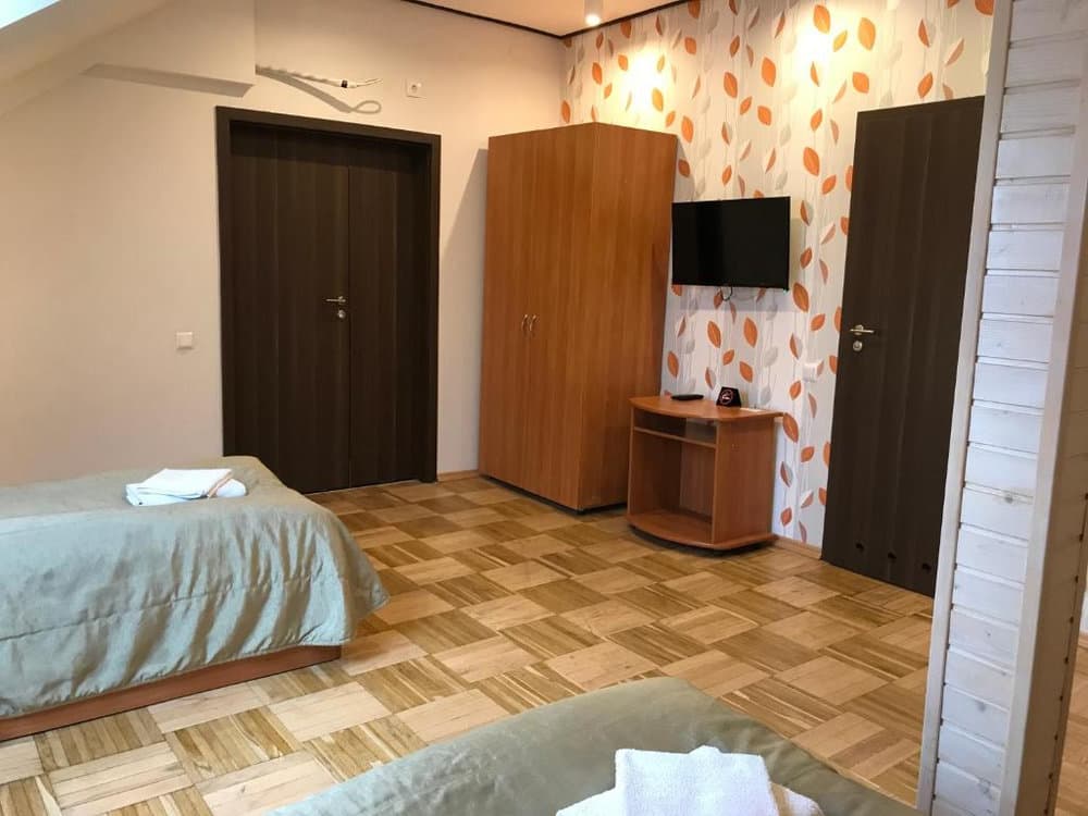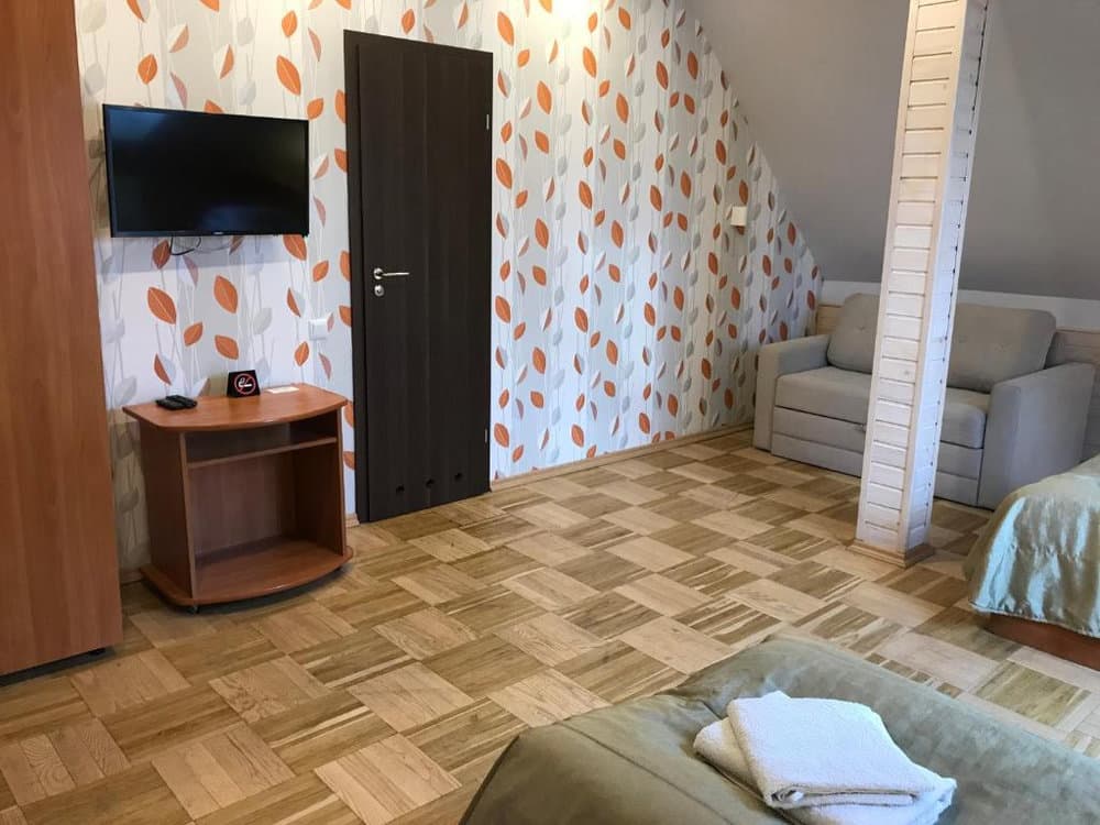 Компактний однокімнатний номер площею близько 20 м², обладнаний двома односпальними ліжками та м’якою частиною. У номері є телевізор із супутниковими каналами та власний санвузол із душем, умивальником і туалетом, а також необхідна кількість рушників для комфортного перебування.
