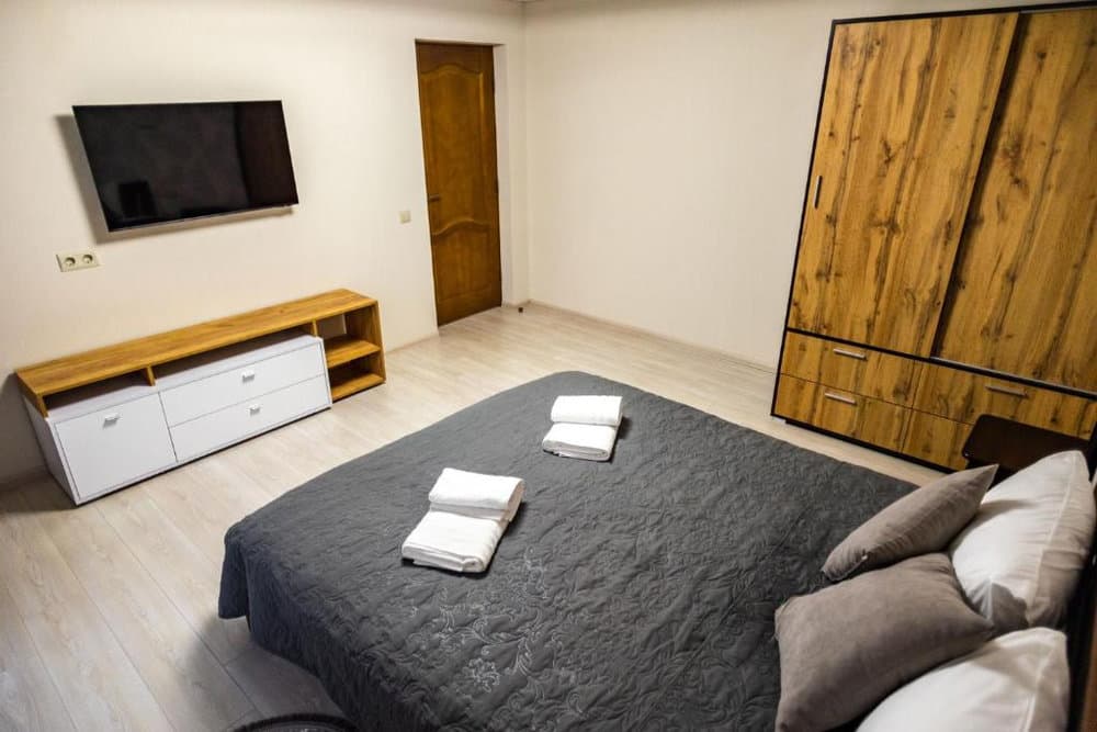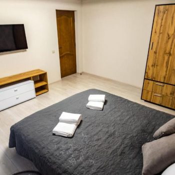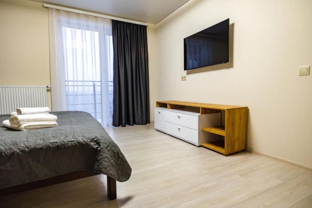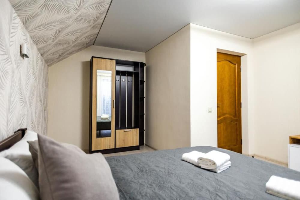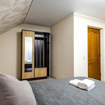 На другому поверсі — три спальні кімнати, де у кожномій є двоспальне ліжко, шафа для одягу, телевізор, вихід на балкон. Санвузол (душ, туалет, умивальник).