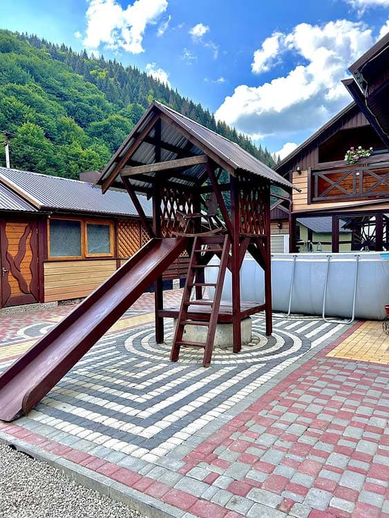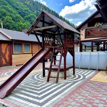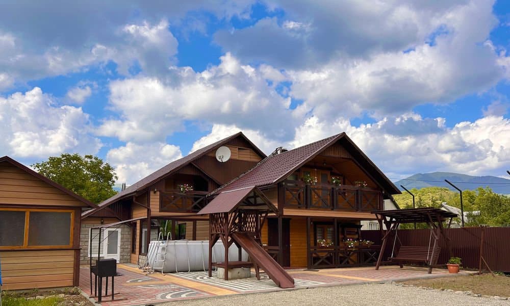 Садиба «Будинок у Драчіка» розташована на виїзді зі села Колочава, всього за 250 метрів від його центру, у зручній та водночас спокійній локації. Це просторий двоповерховий будинок, розрахований на прийом до 20 гостей, що чудово підходить для сімейного відпочинку, подорожей із друзями або організованих груп. Територія облаштована для повноцінного дозвілля: тут є альтанка, мангал, дитячий майданчик, літній басейн, а також сауна на дровах і оздоровчий чан із кімнатою відпочинку.